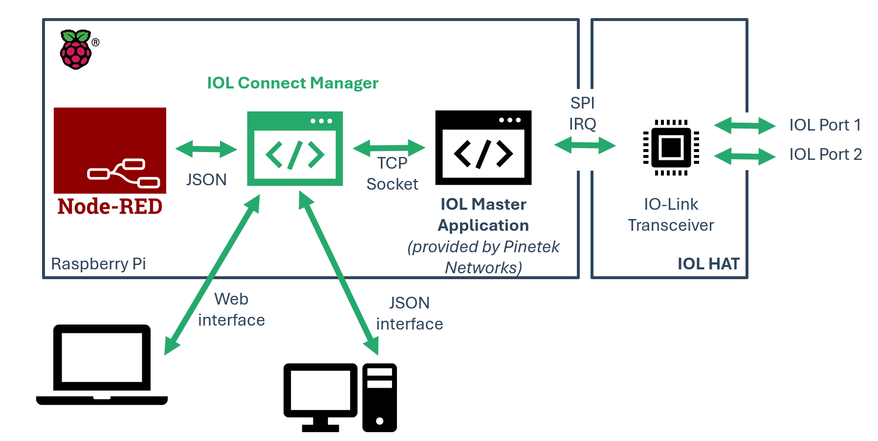The IOL Connect Manager software is a software layer between the raw data (bytestream) of the IOL Master Application (available on GitHub) and Node-RED and JSON/REST interface. Our IOL Connect Manager software is based on the proven Pinebox technology.