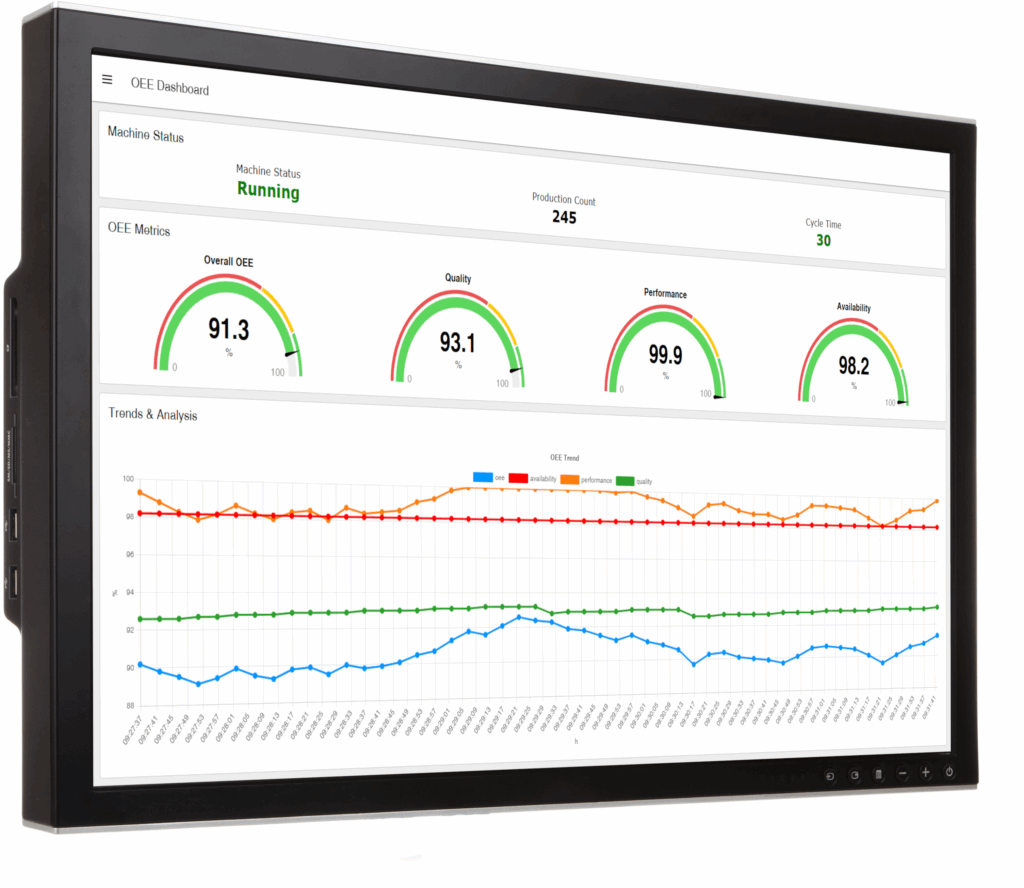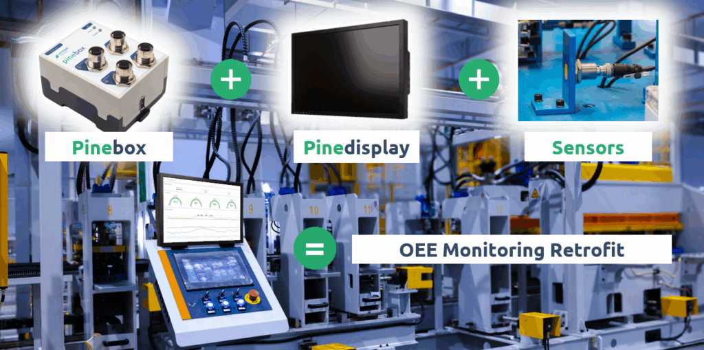 Pinetek Networks delivers everything needed for immediate OEE implementation: industrial sensors, Pinebox gateway, the Pinedisplay device adaper, display screens, and complete setup. Your OEE data becomes instantly available on machine displays and online dashboards, with seamless connectivity to databases and Manufacturing Execution Systems (MES). All you need to provide is power and network connectivity.
