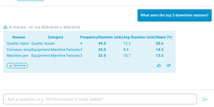 Ask questions about your production data in plain language: “What was the most common failure reason this week?”. Processing runs on European servers, only the required data from OEE Pilot is forwarded to the AI via the Pinetek server, without any customer reference. The AI provider never knows who is making the request and stores no data. GDPR-compliant, no US cloud provider.