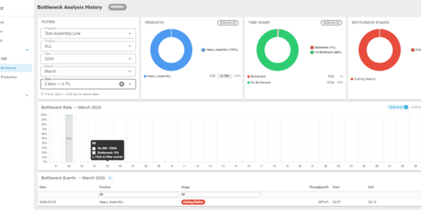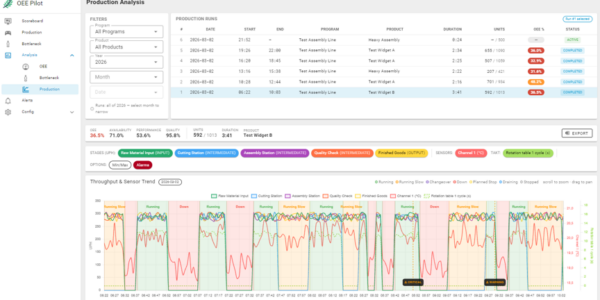 Not every product uses the line the same way. OEE Pilot supports product-specific line configurations: for product A, only three stations are captured; for product B, the entire line. Cycle times, target quantities, and active stations are defined per production program. OEE and bottleneck analysis adapt automatically — no manual reconfiguration during product changeovers.