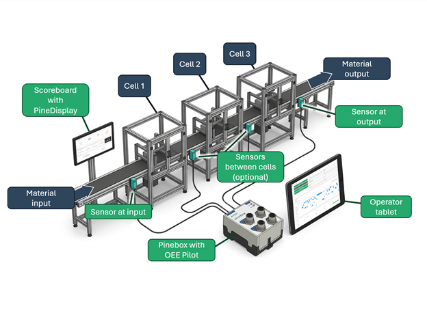 No server, no system integrator, no months-long rollout. Connect sensors, power on the Pinebox, open a browser — the OEE Pilot system is ready to use. Even without an IT department.